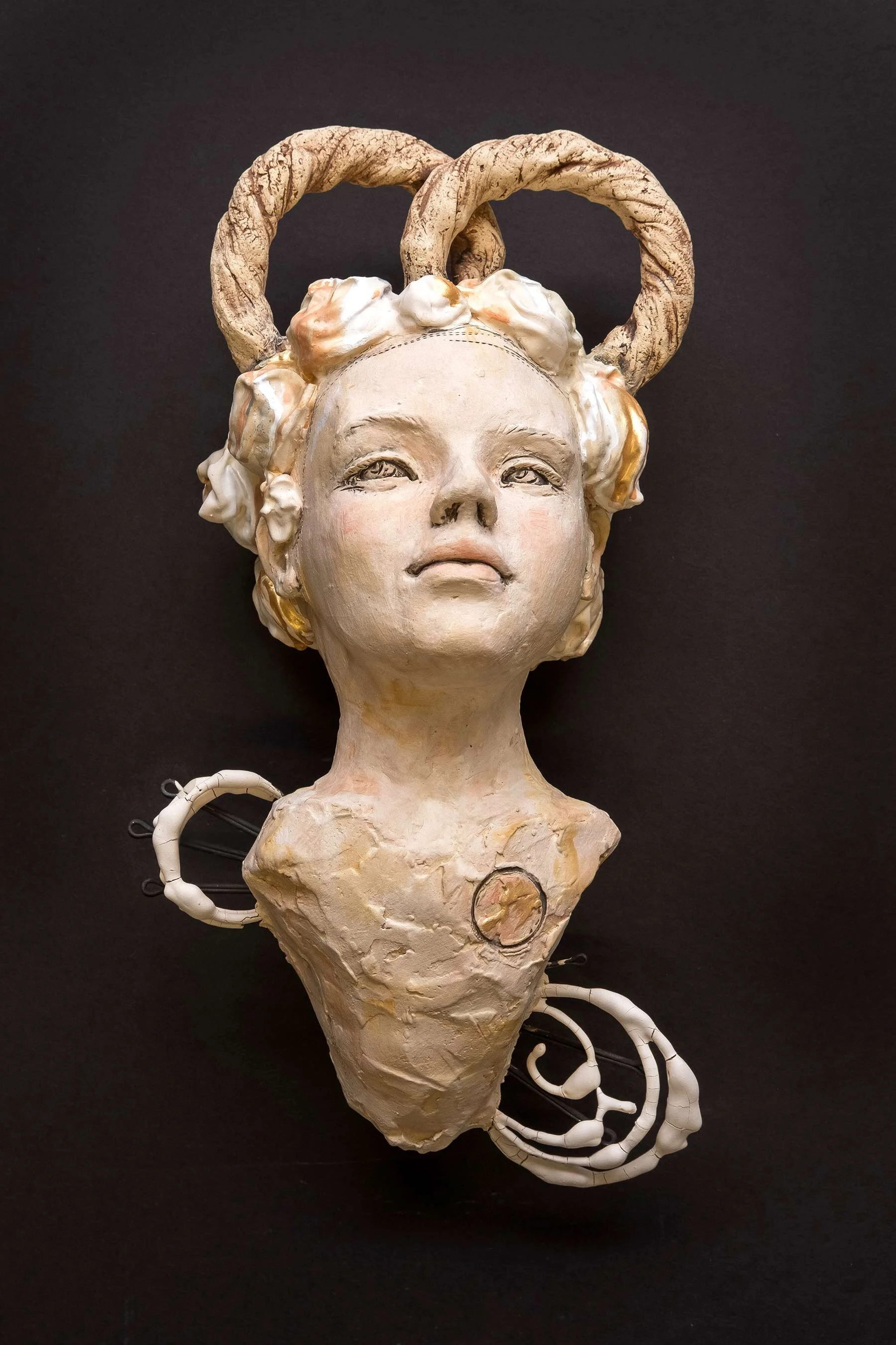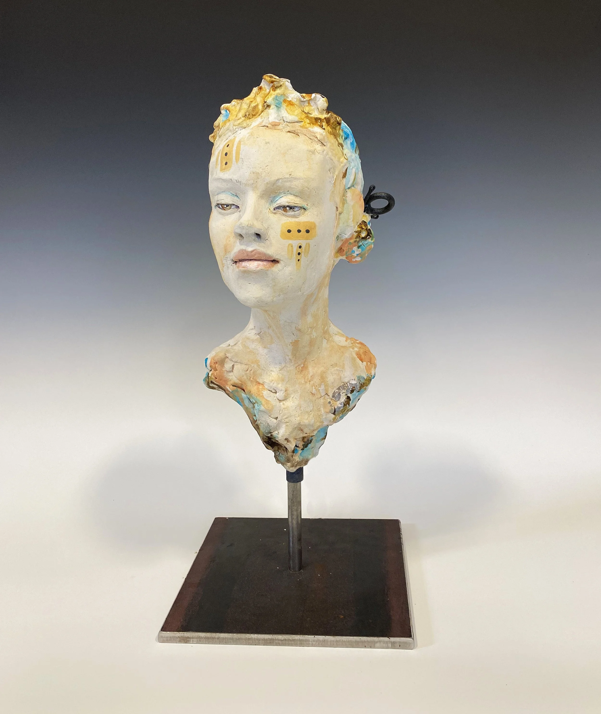 Warrior Princess, metal base, metal additions in her hair. Finished with engobes, underglazes, acrylic ink and acrylic paint. Not for Sale