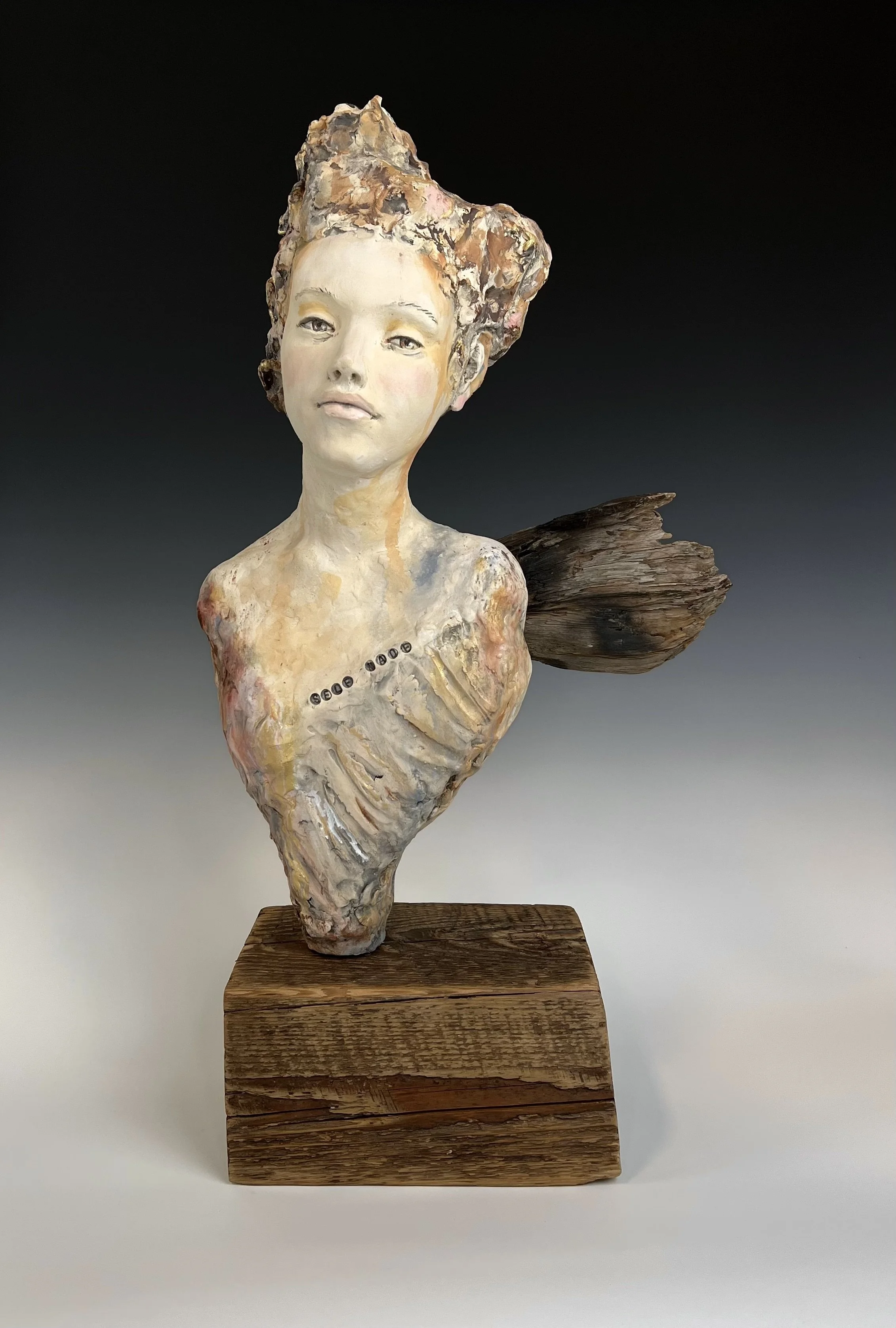 "Self Made", ceramic sculpture, wooden base, found wood from Oregon beach. Finished with engobes, underglazes, acrylic ink and paint.
